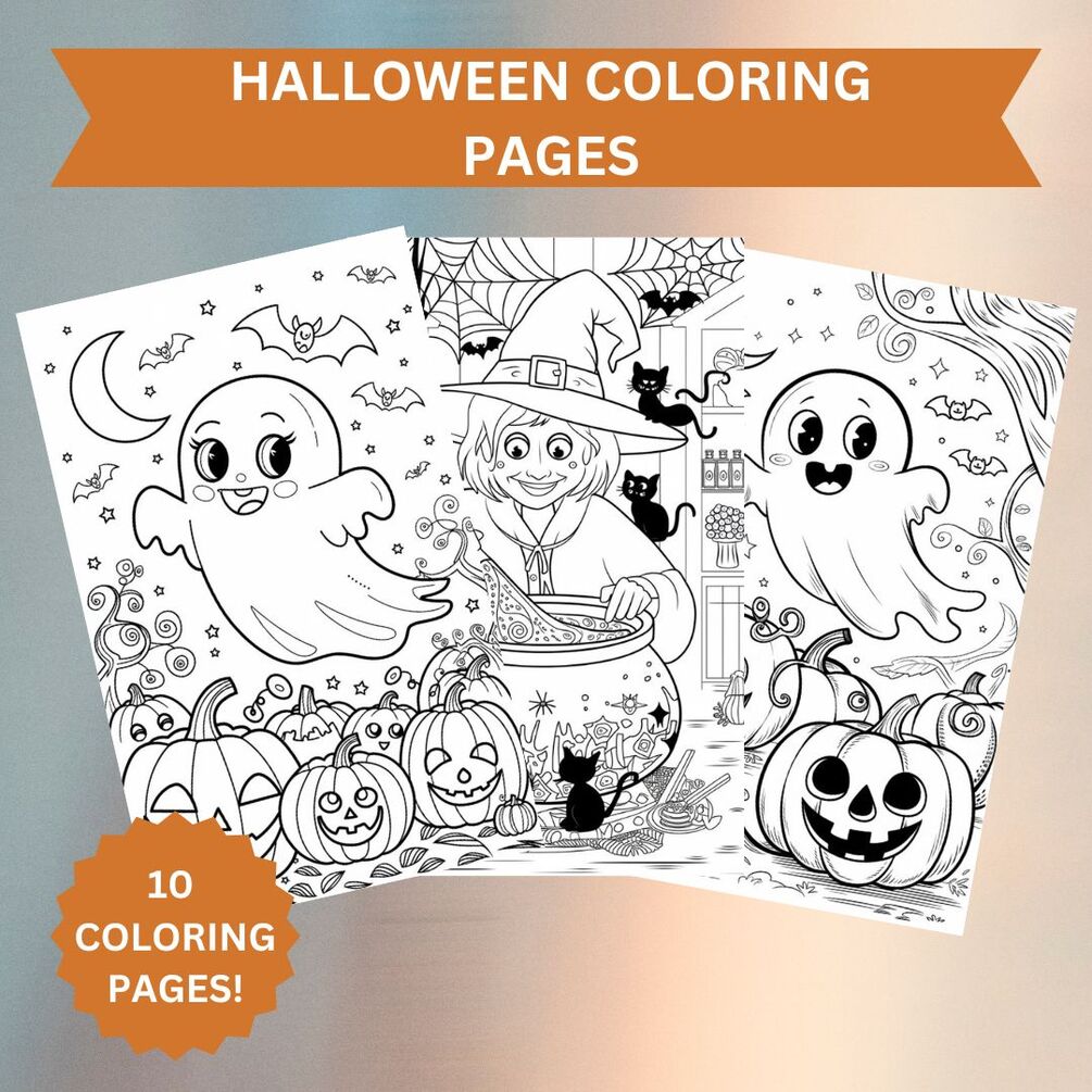 This charming coloring book page features a joyful ghost floating above a pumpkin patch on a Halloween night. The ghost, with a happy expression and wide eyes, is surrounded by playful bats, swirling stars, and a crescent moon. Below, grinning jack-o'-lanterns with carved faces rest in the grass, adding to the festive atmosphere. The scene is set against a backdrop of a tree with curling branches, swirling leaves, and whimsical details that bring the Halloween spirit to life. Perfect for coloring with bright oranges, yellows, and spooky purples!